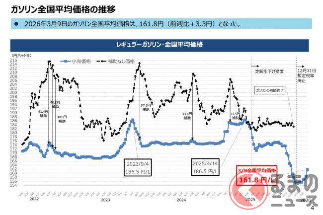 2026年3月9日時点のレギュラーガソリン全国平均小売価格は161.8円となっており、前週比で3.3円上昇するなど、すでに家計や物流への影響が表面化しはじめています。