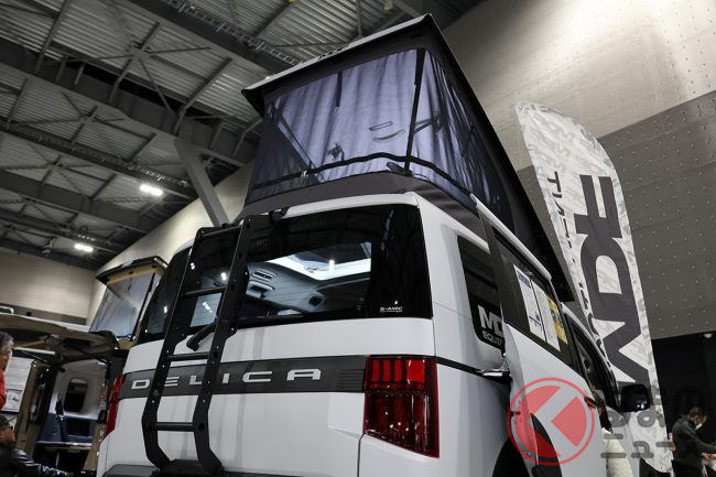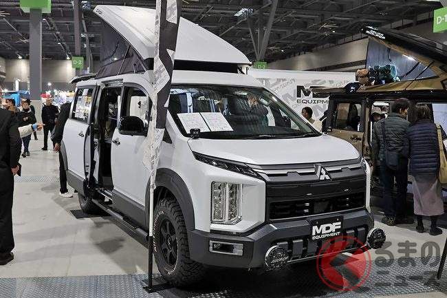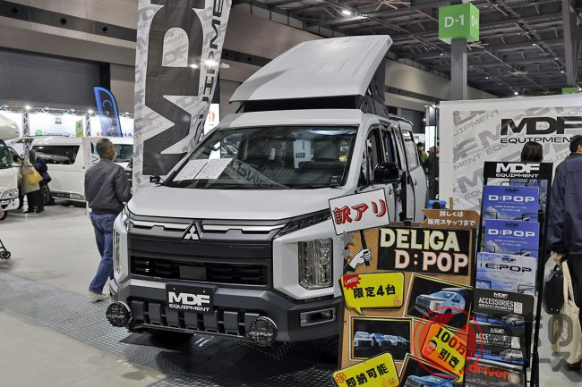 西尾張三菱自動車販売が手がける「MDFエクイップメント」(愛知県一宮市)のブースでは、人気のアウトドアミニバン「デリカ D:5」をベースに、ポップアップルーフなどを装着した車中泊仕様「D:POP(ディーポップ)」が注目を集めていました。