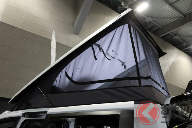 ポップアップルーフ展開時には、フルオープン/メッシュ地(虫除け)/ネオプレーン地(保温・撥水)という3つの使い方を可能に。また、展示車のようにリアラダー(オプション)を装着しておけば、車外からもアクセス可能です。