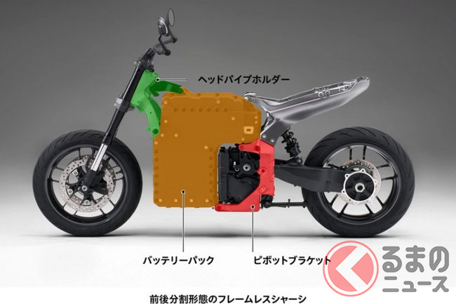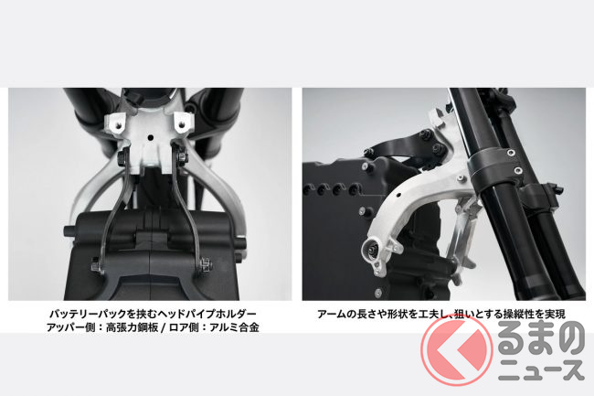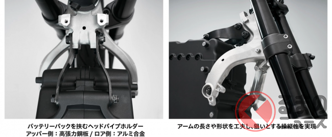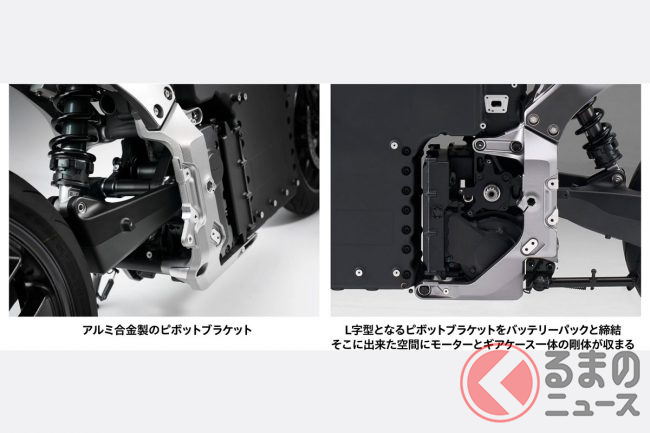 車体構造も独特で、一般的なバイクに見られるフレームが存在せず、車体の中央に置かれたアルミ製バッテリーケースを骨格の一部として活用する構造が採用されました。ステアリングを保持するヘッドパイプと車体の後方を支えるピボットブラケットは、同じく中央に配置されたパワーユニットに直接取り付けられています。