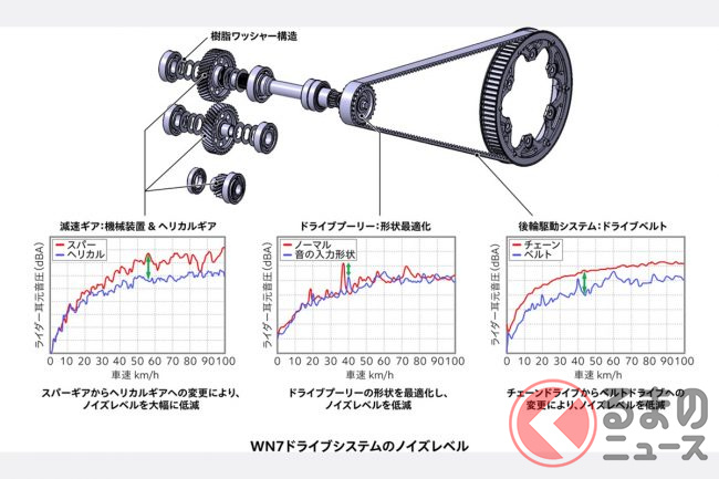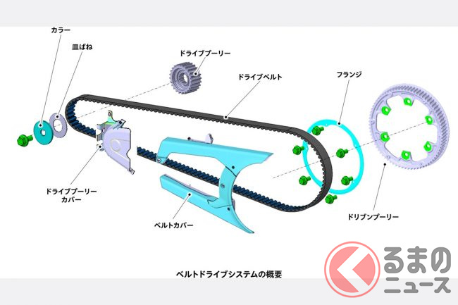 モーターの出力は、新開発のギアボックスを介してベルトドライブに伝えられ、リアタイヤを駆動します。この駆動方式は静粛性の向上にも貢献しています。