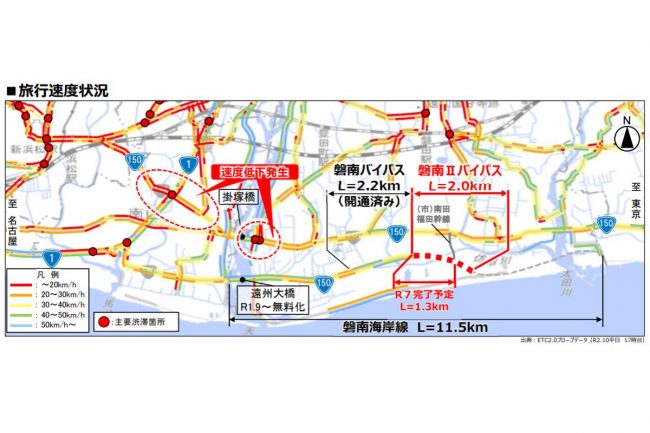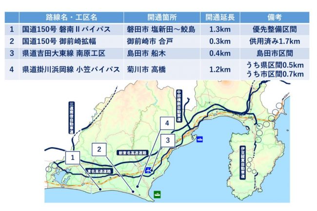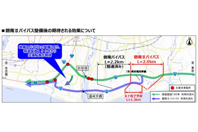 また、「掛塚橋東」交差点、「輪町」交差点、「石原町」交差点の3カ所で日常的に発生していた慢性的な交通渋滞も緩和され、当該地域を出入りする交通の流れが改善すれば、磐南IIバイパス周辺に限らず、静岡県の産業活性化につながると期待されています。