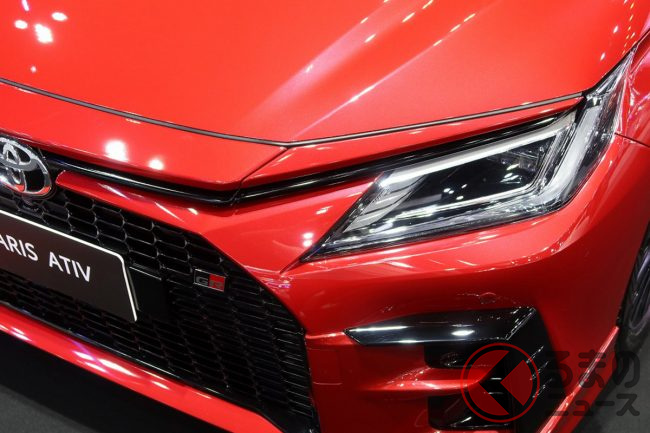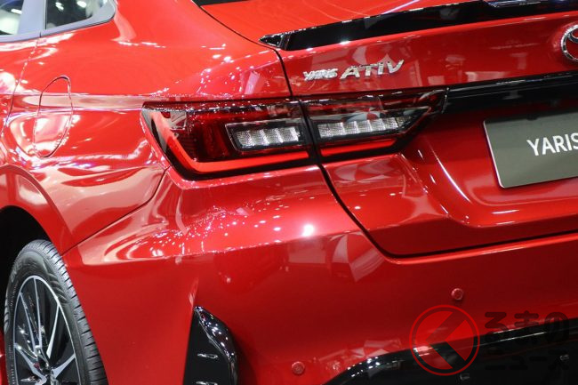 トヨタの最新型「ちいさな“スポーティセダン”」! 全長4.4m級ボディ×迫力の「大口顔」採用! 1.5リッター「直4」搭載の「ヤリス エイティブ HEV GRS」泰国モデルとは