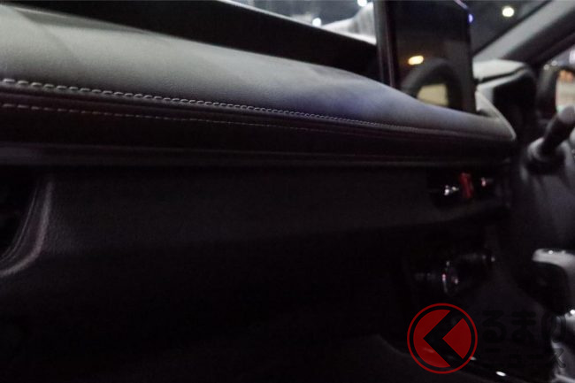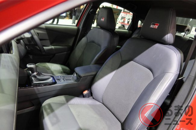 インテリアはブラックでまとめ、合成レザーのシートをはじめ随所にグレーのステッチを入れています。ステアリングホイールやヘッドレストにGRロゴをあしらって、GRの世界観を魅せていますね。