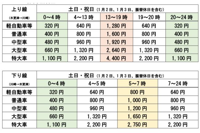 具体的な普通車のETC料金を見てみると、上り線では混雑する13時から19時が1600円に設定される一方、20時から24時は800円、深夜0時から4時は400円と、時間帯によって最大4倍の開きがあります。