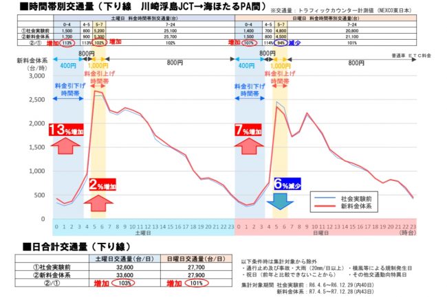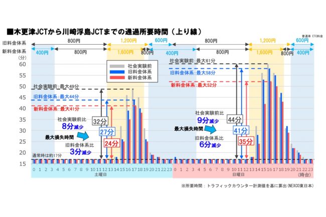 一方、川崎から木更津方面へ向かう「下り線」については、料金引き下げ時間帯の交通量が増加したものの、最大損失時間はほぼ「横ばい」という結果になりました。