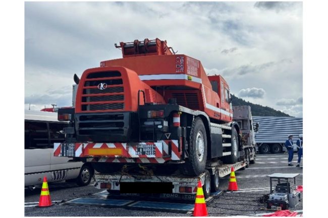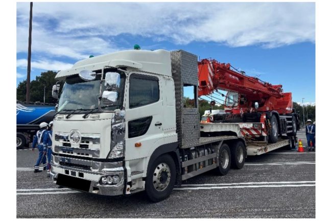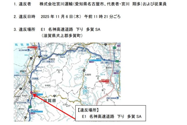 今回、NEXCOと高速道路機構が警察に告発した事案は、2025年11月6日の名神高速で発生しました。違反者のM運輸(名古屋市)は同日11時21分、下り線の多賀SAをラフテレーンクレーンを積載する大型トレーラーで通過しました。