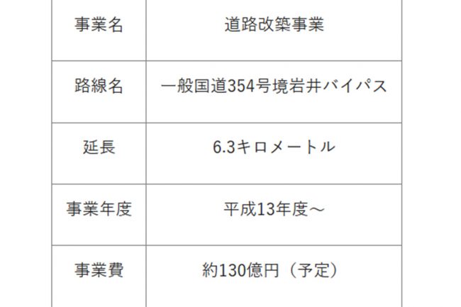 このうち、茨城県内の猿島郡境町猿山から坂東市生子(おいご)までの延長6.3kmの区間において、「境岩井バイパス」の整備が進められてきました。事業費は約130億円が予定されています。
