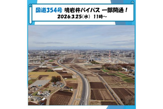 茨城県などで整備が進められていた国道354号「境岩井バイパス」のうち、猿島郡境町山崎から伏木までの約3.2kmが、2026年3月25日午前11時に開通します。