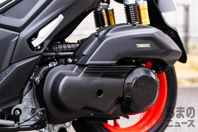 日本での主要諸元は未発表となっていますが、海外モデルのスペックによると、パワートレインには、排気量155ccの最新世代「Blue Core」 VVA(可変バルブ)エンジンが搭載されています。このエンジンの注目すべき点は、ヤマハ・エレクトリックCVT(YECVT)技術の採用です。この革新的な技術は、まるでターボチャージャーが付いているかのような力強い加速感を生み出し、加速・減速時のレスポンスを飛躍的に高めています。