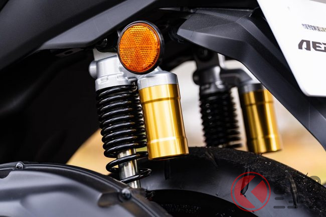 この卓越した走行性能を支えるため、足回りも入念に強化されています。フロントサスペンションはインナーチューブ径を拡大し、リアにはサブタンク式のリアサスペンションを装備することで、路面追従性と走行安定性の向上を図りました。