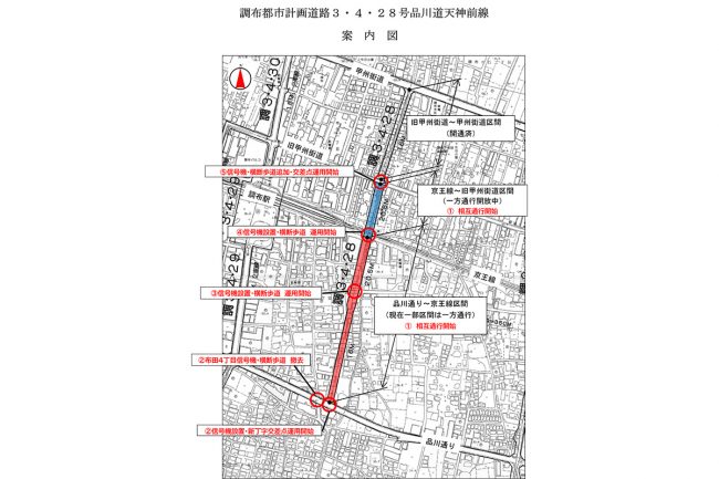 品川通りから甲州街道までが一本で繋がり、これまでの部分的な一方通行区間も相互通行へと変更されたことで、調布駅周辺の南北交通の利便性が向上します。