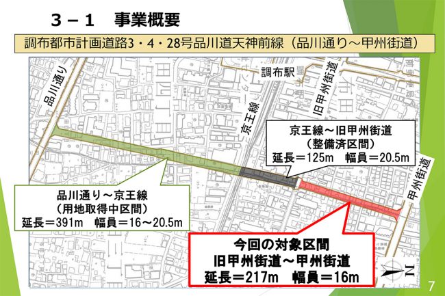 「調布都市計画道路3・4・28号品川道天神前線」は、調布駅の東側を南北に貫く重要な幹線道路です。