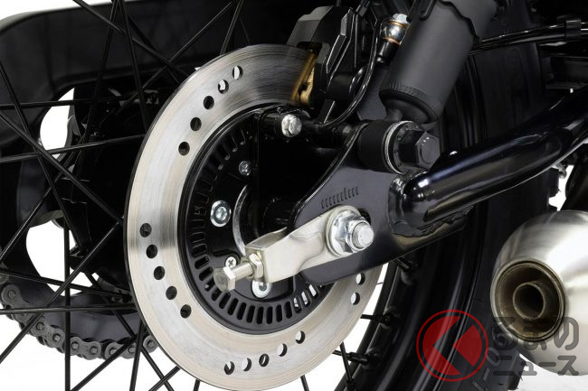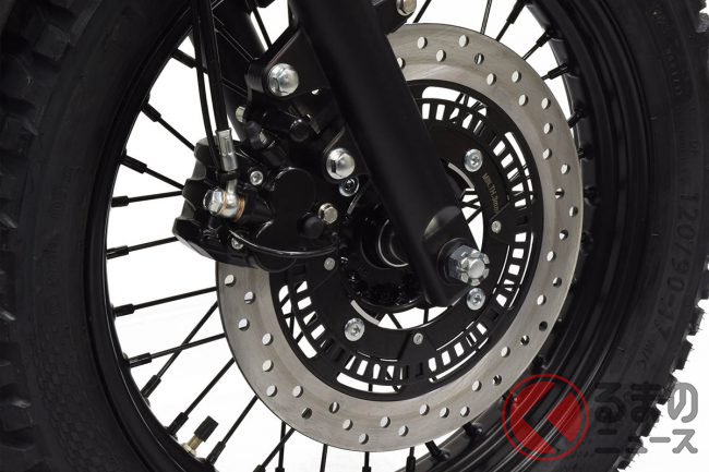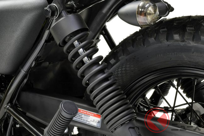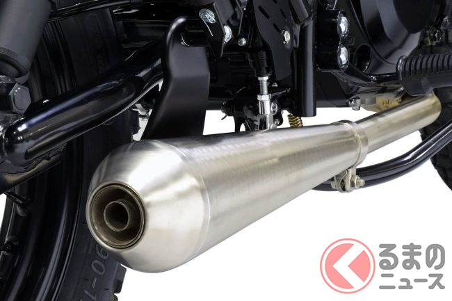 排気系には、レトロな雰囲気を醸し出すテーパー形状のメガホンマフラーが装着されます。このマフラーは、シングルエンジンの魅力を引き立てるキレの良いサウンドを奏でます。