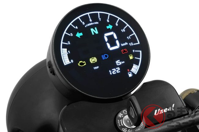 メーターは、ブラックディスプレイに浮かび上がるデジタル表示を採用したラウンド型で、ギアポジションやバッテリー警告など各種インジゲーターを備え、高い視認性を確保しています。