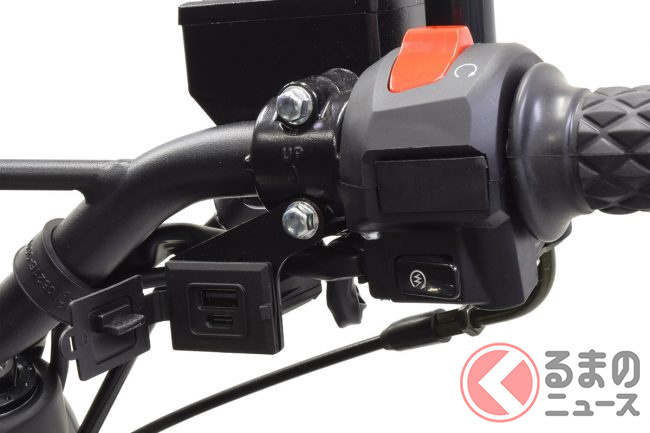 現代のライダーには欠かせない装備として、スマートフォンの充電などに使えるUSB給電ポート(Type-A + Type-C)も標準で搭載しています。右側のハンドルスイッチ部分に配置されているため、ナビゲーションシステムなどへの配線も容易です。