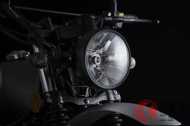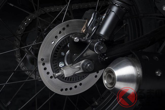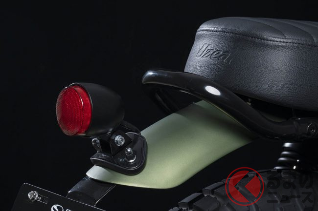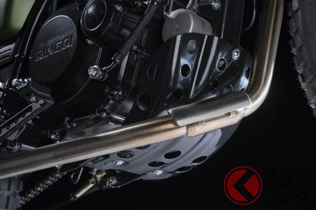 排気系にはテーパー形状が目を引く、レトロなデザインのメガホンマフラーが採用されました。シングルエンジンの魅力を際立たせるキレの良い排気音を奏でます。このマフラーには、保護を目的とした専用ガードも装着されます。