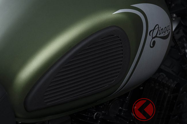 燃料タンクは、美しいプレスラインとマット仕上げの塗装がレトロな質感を高めています。容量は14Lを確保しており、燃料もレギュラーガソリン仕様であるため、長距離のツーリングでも安心感があります。また、BIGFOOT250 Scramblerにはニーパッドが標準で装備されています。