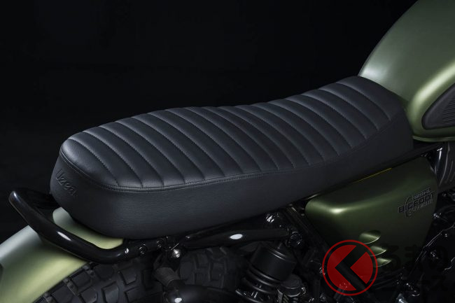シートには、質感に優れたヴィンテージ調のクラシカルダブルシートが採用されています。フラットで前後に長く、幅も確保された座面は、ライダーに自由度の高いライディングポジションを提供します。利便性を考慮したサイドグリップとグラブバーも備えられています。