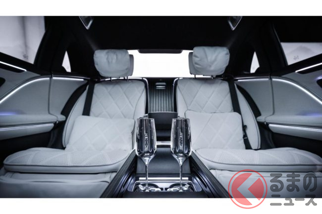 ボタンひとつで優雅に開閉する「自動コンフォートドア」をはじめ、専用の冷蔵庫、そして揺れる車内でも倒れないようにホールドされる「Robbe & Berking」社製の銀製シャンパングラスなど、まさに走るファーストクラスと呼ぶにふさわしい至れり尽くせりの装備が用意されています。