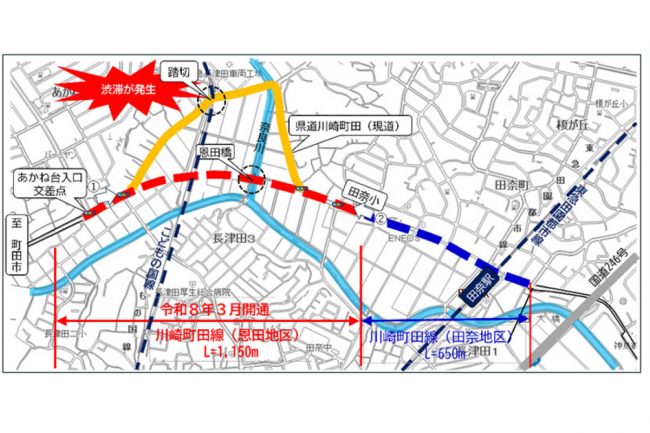 これまで、並行する既存の県道では、東急こどもの国線の「長津田2号踏切」が存在し、列車の通過に伴う交通遮断が原因で慢性的な渋滞が発生していました。
