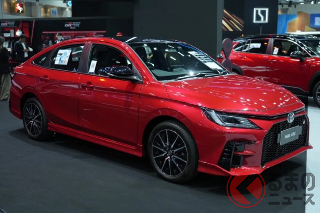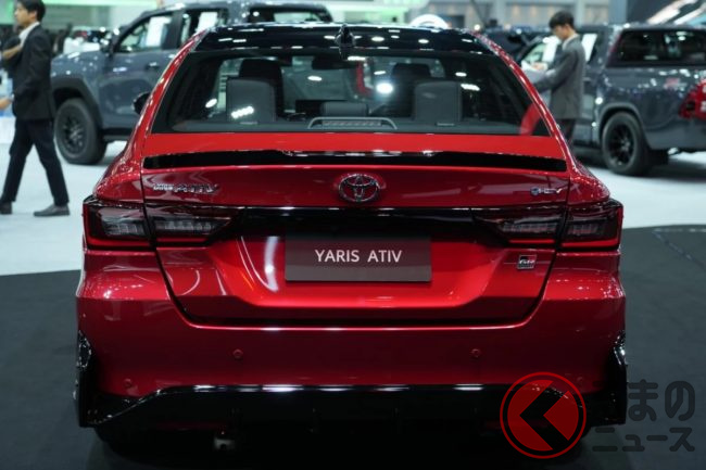 トヨタ新「コンパクトセダン」登場! 全長4.4m“ちょうどいいボディ”に「GR」仕立ての“専用デザイン”&チューニング採用! スポーティな内装もグッドな「ヤリス ATIV HEV GRスポーツ」タイで実車展示!