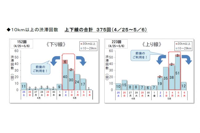 対象期間の10km以上の渋滞回数は上下線合計で375回となり、昨年から2割の増加が見込まれています。