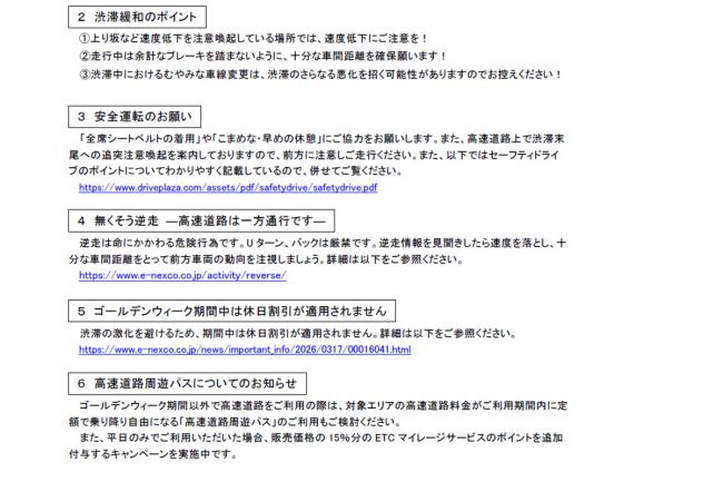 なお、渋滞の激化を防ぐ措置として、今回のゴールデンウィーク期間中(4月25日〜5月6日)は、ETC車を対象とした「休日割引」は適用されません。
