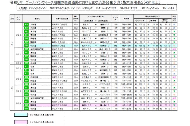 NEXCO東日本、NEXCO中日本、NEXCO西日本、JB本四高速、および日本道路交通情報センターは、2026年のゴールデンウィーク期間中(4月25日〜5月6日)の高速道路における渋滞予測を発表しました。