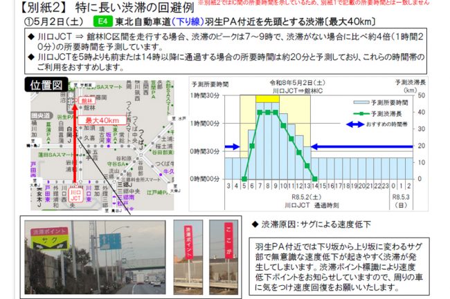 例えば、5月2日の東北道下り線(羽生PA付近)の渋滞を通過する場合、ピーク時(7時〜9時)の所要時間は約1時間20分と予測されていますが、5時以前または14時以降に通過すれば約20分で済むとしています。