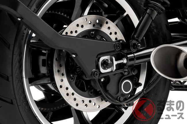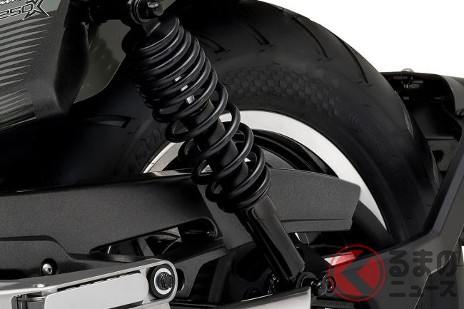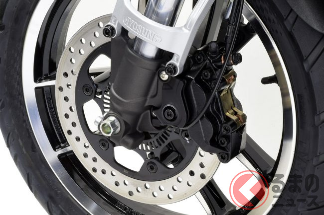 足回りには、フロントに剛性の高いφ41mmの倒立フォーク、リアにはオーソドックスなツインショックを採用。ブレーキはフロントに対向4POT、リアに対向2POTキャリパーを備えたディスクブレーキを装備しています。