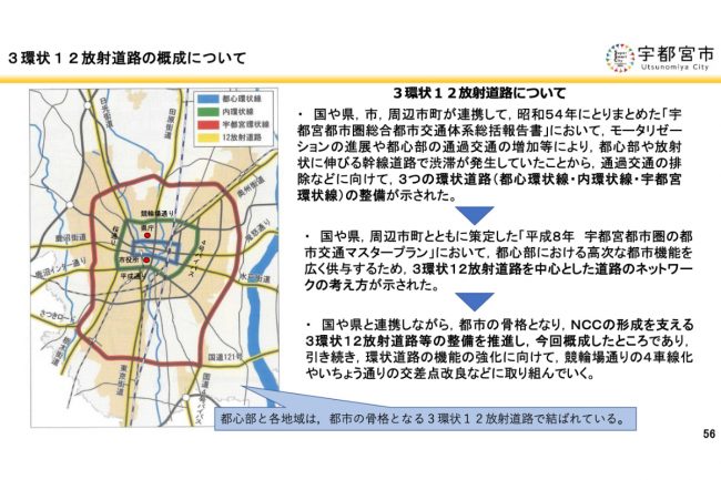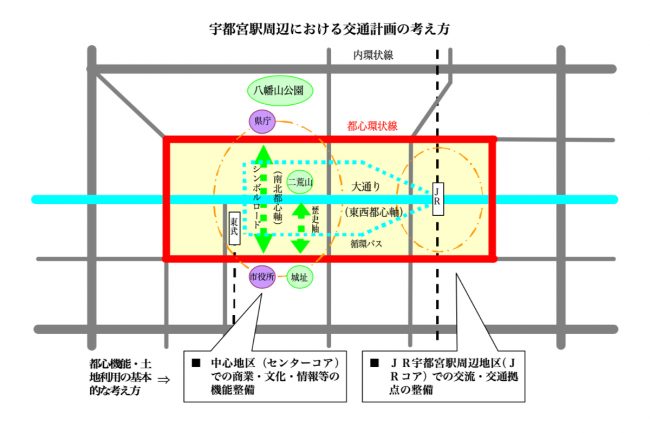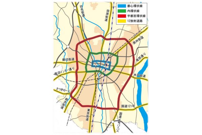 2つの環状線の役割として、外縁部にある宇都宮環状道路が広域交通を処理し、内側の都心環状線が中心街の交通を整えるという構造になります。