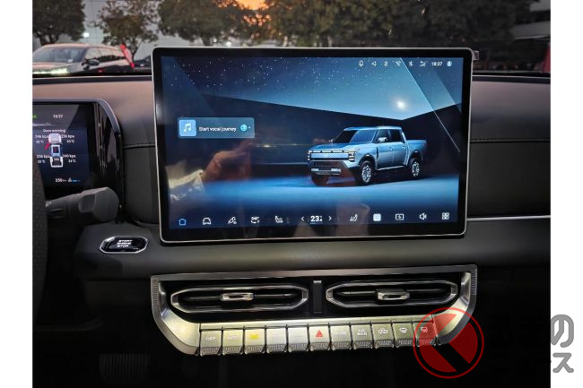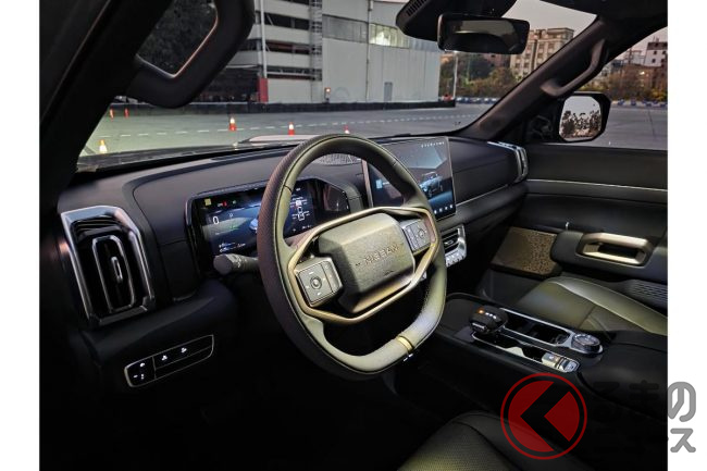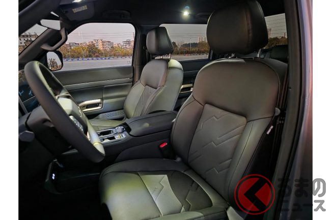 インテリアは水平基調のインパネにバイザーレスのスピードメーター、センターに大型ディスプレイ(14.6インチ)などはN7/NX8と同じイメージですが、センターの物理ボタン(空調系)やフロアシフト、4WDのコントロールダイヤルなどにより、僅かにワイルド仕立て。ただ、各部の仕立てや質感の高さは乗用車と変わらないレベル。