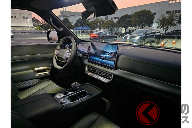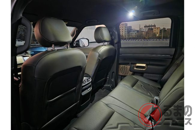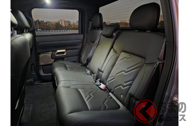 注目はリアシートの居住性で3300mmのホイールベースを活かした足元スペースの広さに加えて、シートバックの角度がSUV並みに自然(ダブルキャブのシートバックは立ち気味がほとんど)なのは嬉しいポイント。