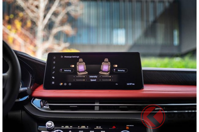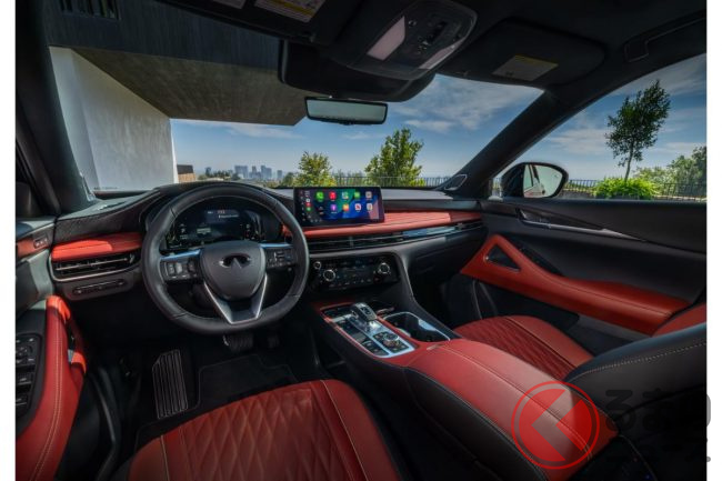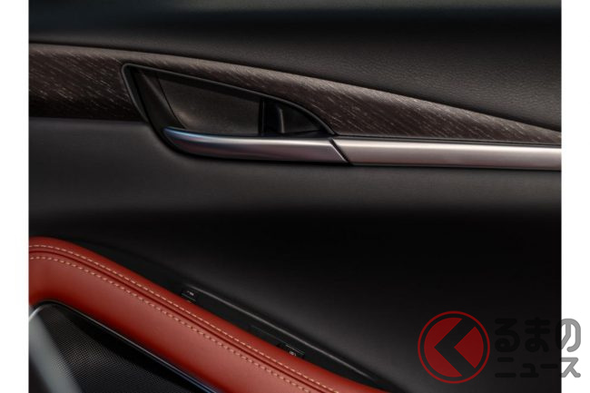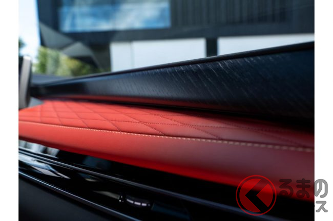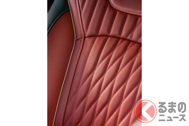 インテリアにはオープンポアのウッドトーンアクセント、キルティングされたダッシュボード、そして着物の重なる折り目からインスピレーションを得たという非対称のダイアゴナルキルティングパターンが施されたセミアニリンレザーシートが採用されています。