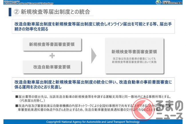 また、審査についても「新規検査等書面審査要領」に一本化され、これまで交付されていた「改造自動車審査結果通知書」の交付も廃止されます。