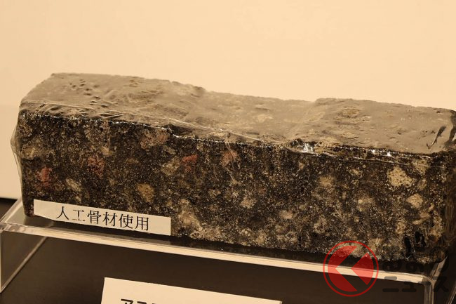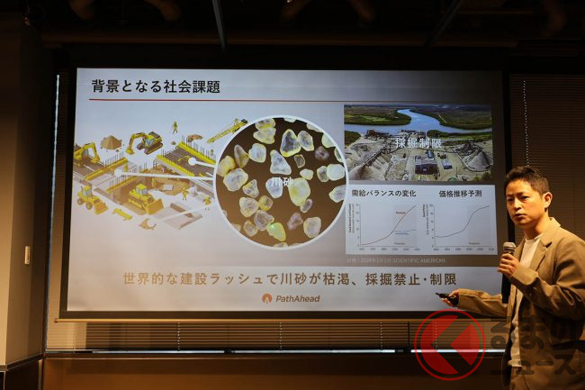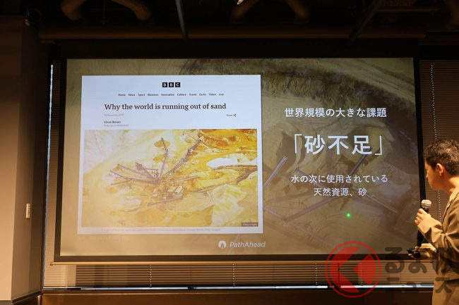 この着想の背景には、深刻な社会課題があります。現在、コンクリートやアスファルトに不可欠な砂や砂利は、水の次に資源リスクが高いとされています。河川や山から採掘される砂は環境破壊につながるため採掘が制限され、価格が高騰し続けています。