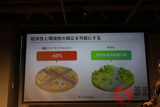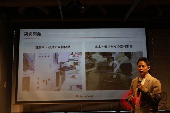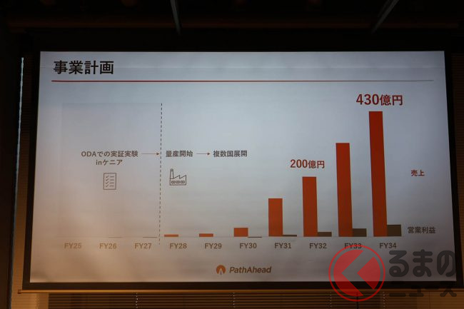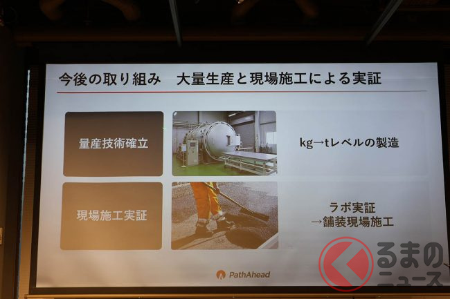 今後の計画として、2028年に量産を開始し、事業をスケールさせていきます。2034年には400億円の営業利益を目指しており、当面の課題は、ラボスケールで数キログラム単位の製造に留まっている技術を、トン単位で製造できる量産技術へと確立すること、そして実際の道路で耐久性を実証することです。