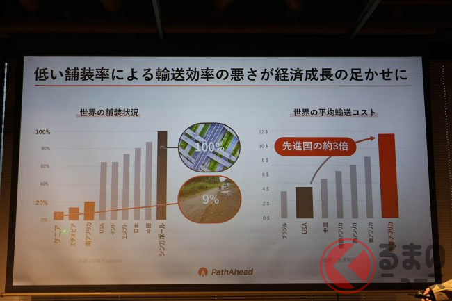 アフリカの多くの国では道路の舗装率が極めて低く、激しい渋滞や物流の非効率化を招いています。その結果、輸送コストは先進国の3倍以上に達するそうです。