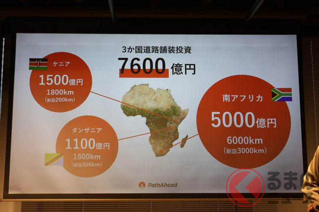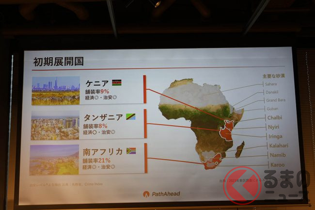 PathAheadは、舗装率が低く、砂漠があり、ビジネス環境が整っているアフリカの3カ国(ケニア/舗装率9%、タンザニア/舗装率8%、南アフリカ/舗装率21%)を最初のターゲット市場としています。