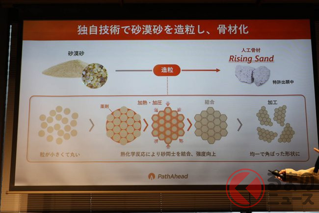 この課題に対し、PathAheadが開発したのが、人工骨材のライジングサンドです。細かく丸いため、そのままでは骨材として使えなかった砂漠の砂を、「増粒」という独自技術で大きくし、高強度な人工石を生成します。
