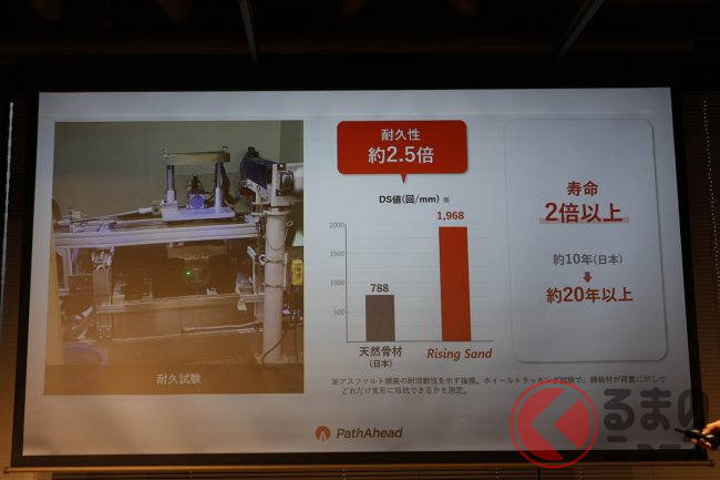 このライジングサンドは、工業製品のように均一な品質で製造できる点が特徴です。耐久性を測るホイールトラッキング試験では、日本の良質な天然骨材と比較して2.5倍以上の耐久値を示しました。