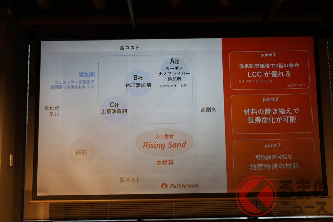 これにより、道路のライフサイクルコストを大幅に低減できるだけでなく、川砂や砕石の採掘が不要になるため、環境にも配慮できます。競合の耐久性向上技術が、調達性に課題のある添加剤アプローチであるのに対し、ライジングサンは豊富に存在する砂漠の砂を主材料とすることで、「高耐久」「低コスト」「高い調達性」というユニークなポジションを確立しています。