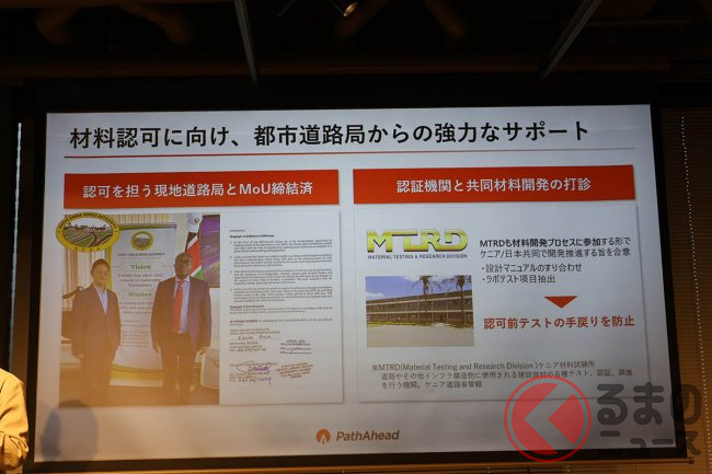 特にケニアでは、すでに都市道路局とMOU(基本合意書)を締結し、実証実験に向けた準備を進めているところです。現地の建設業者からも、認可が下り次第購入したいとの声が寄せられているそうです。