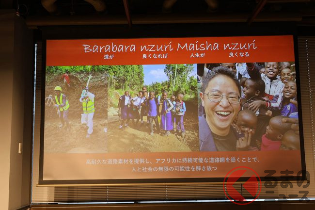 伊賀氏は、同発表会で事業の原点となったケニアでの経験を語りました。現地で道路工事を行った際、地元の子どもたちから非常に喜ばれ、「Barabara nzuri Maisha nzuri (バラバラ ンズーリ マイシャ ンズーリ)」というスワヒリ語のことわざを教わったそうです。これは「道が良くなれば人生が良くなる」という意味を示します。