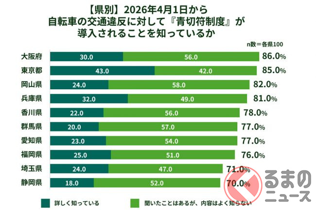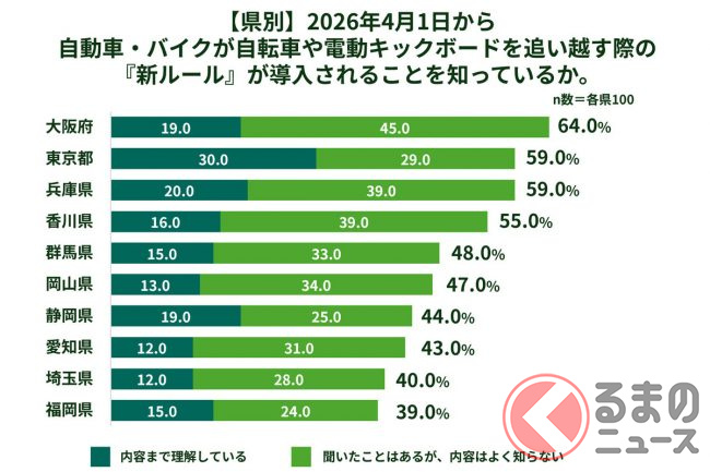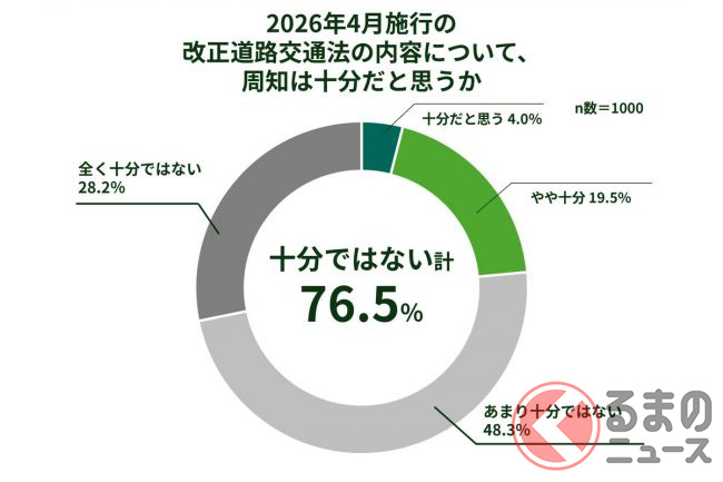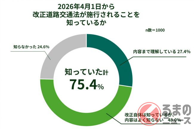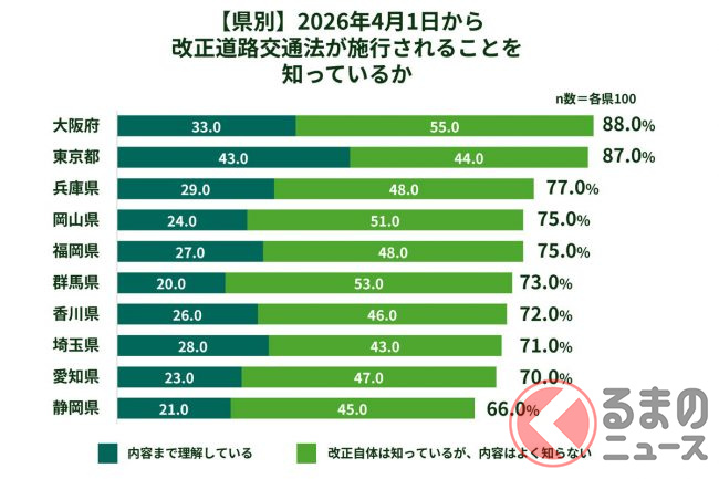 改正道路交通法は2026年4月1日に施行。三井住友海上火災保険によると、施行されることへの認知は75.4%に達したものの、「内容まで理解している」人は27.4%にとどまり、約半数は「内容はよく知らない」と回答したといいます。また、東京都や大阪府では内容の理解率が高い一方、岡山県や群馬県、愛知県、静岡県は20%台前半と、地域差が見られる結果となりました。