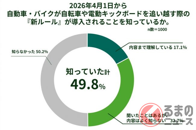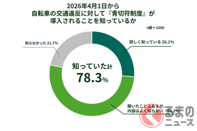 自転車の交通違反に反則金を課す“青切符”制度の導入について認知している人は78.3%でしたが、「詳しく知っている」人は26.1%にとどまり、クルマやバイクが自転車や電動キックボードを追い越す際に十分な側方間隔を保つことを求める新ルールについては、認知している人が49.8%、内容理解は17.1%でした。