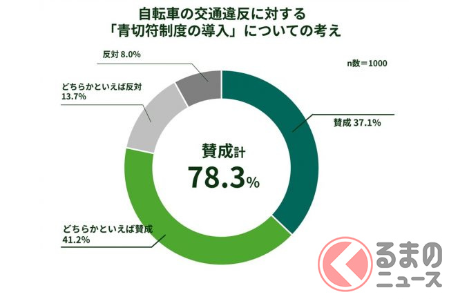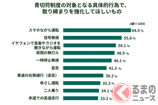 自転車の交通違反に対する“青切符”制度の導入について、「賛成」「どちらかといえば賛成」と答えた人は78.3%に達しました。また、取り締まり強化を求める違反行為として最も多かったのが「スマホながら運転」(64.5%)で、以下「信号無視」(55.6%)、「イヤホンで音楽やラジオを聴きながら運転」(50.1%)、「夜間の無灯火」(48.9%)と続きます。
