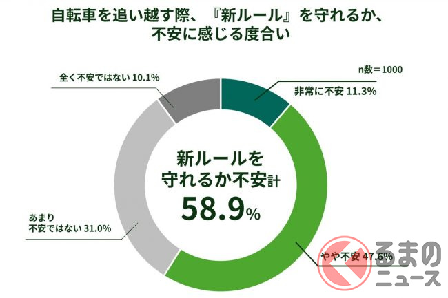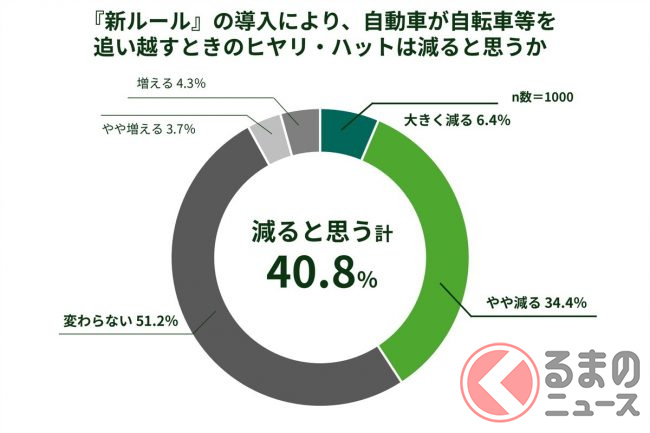 クルマで自転車や電動キックボードを追い越す際に十分な側方間隔を保つことが定められた新ルールにより、ヒヤリ・ハットが「減ると思う」と答えた人は40.8%と、「変わらない」(51.2%)と答えた人を下回る結果となりました。また、追い越し時の新ルールを「守れるか不安」と答えた人は58.9%に達し、三井住友海上火災保険は「『十分な間隔』の基準が明確に定められていないことや、内容の理解不足が新ルールの効果に対する懸念や不安につながっている可能性がありそうだ」と分析します。