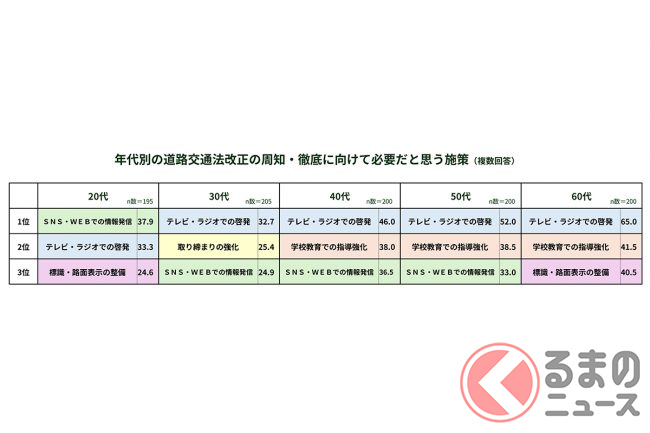 また76.5%が「改正道路交通法の周知が十分ではない」と答えています。周知に必要と考える施策は年代ごとに異なり、20代では「SNS、WEB」、30代以降は「テレビ、ラジオ」が1位でした。